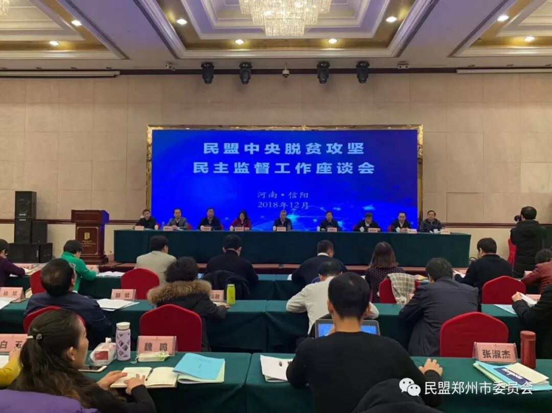 12月12日至14日,民盟郑州市委主委郝伟、专职副主委张洛通一行3人赴信阳参加2018年民盟中央脱贫攻坚民主监督座谈会。会议深入贯彻中共十九大精神,落实中共中央决策部署,进一步研究做好对口河南脱贫攻坚民主监督工作。全国人大常委会委员、民盟中央副主席龙庄伟,省人大常委会副主任、中共信阳市委书记乔新江,民盟河南省委主委、副省长霍金花、民盟中央社会服务部副部长段海溪、省扶贫开发办公室党组成员、副主任汪继章出席会议。民盟中央社会服务部部长刘圣宇主持会议。民盟中央专家组成员、全国18个省级盟组织和河南省18个市级盟组织的领导、专家、机关干部130余人参加会议。